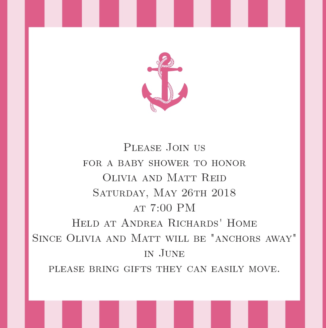 The perfect fit were these nautical baby shower invitations templates, HOW CUTE! My sister and Matt are heading to Florida for work before their little nugget is born, so a “bon voyage” “anchors away” type theme was just perfect.