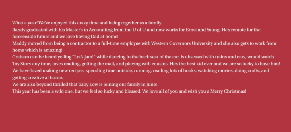 Sam and Kate got married! The day after Christmas was a whirlwind of heading to the temple, pictures, the lunch, and a brief stop at the reception. Things were different with COVID but it was still beautiful. Graham was a TROOPER and was soooo tired. But he did so awesome and wore his mask, was friendly and kind, and just was so well behaved. We couldn’t be more proud! We are so happy for Sam and Kate and can’t wait to have Kate in our family.